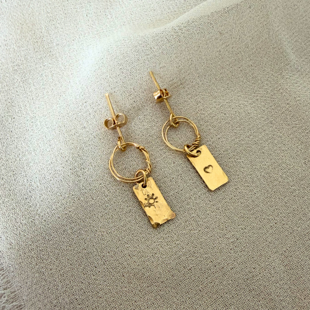 Deux talismans à porter près de soi.Ces boucles d’oreilles dorées associent un petit anneau délicat…