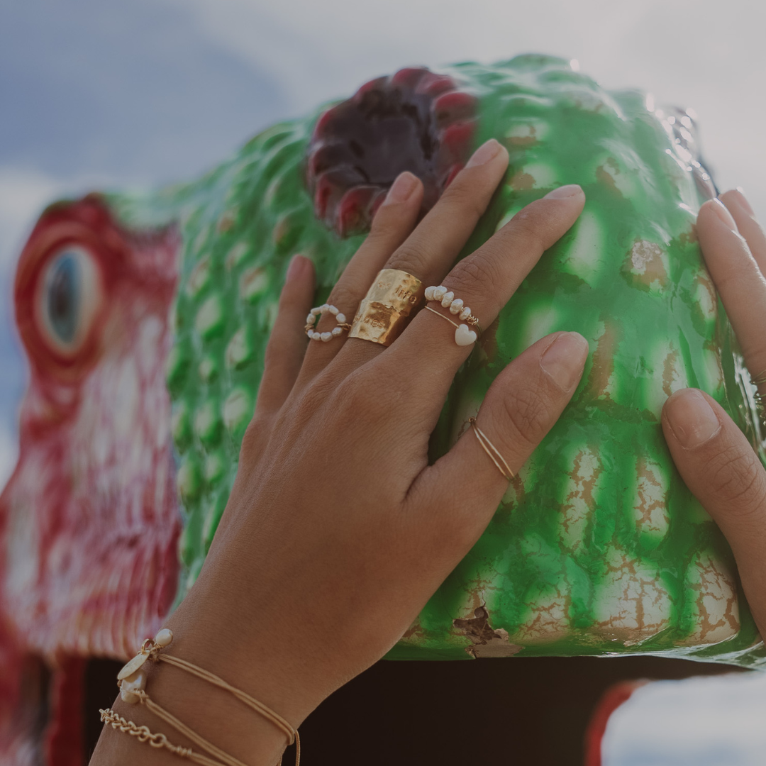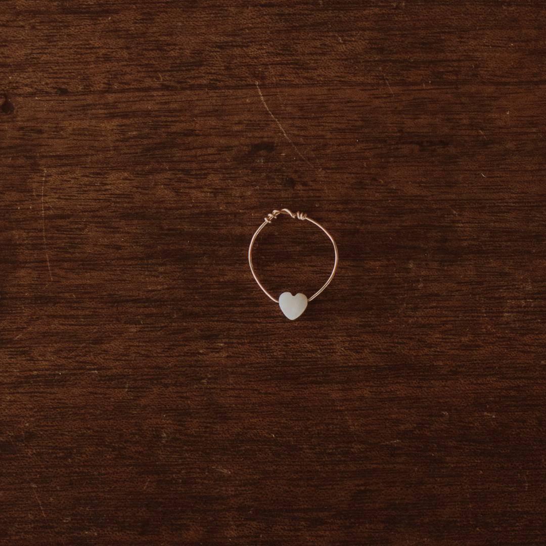 Cette bague minimaliste joue sur la finesse d’un fil d’or et l’éclat tendre d’un petit cœur nacré, symbole d’émotion spontanée.